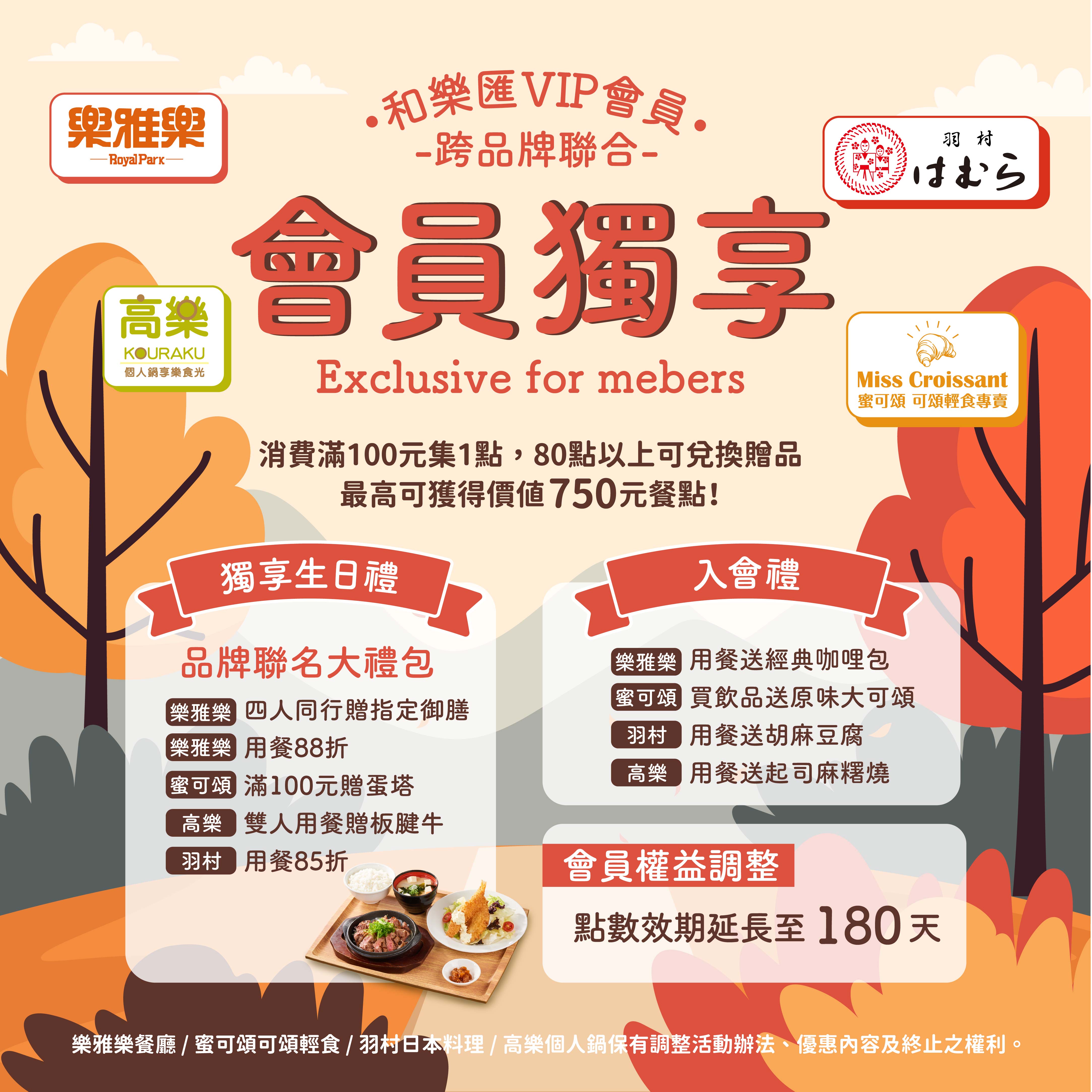 公告|會員權益調整 為了提供顧客更便利的使用體驗,和樂匯VIP會員將於2025.10.01起進行點數有效期限調整,點數效期從原本90天延長至180天。感謝您一直以來的支持與愛護,我們持續優化會員服務,希望能帶給您更完善的消費體驗、貼心的服務、愉悅的用餐。 ・2025.09.30前發出的有效點數,由原到期日統一延長至2026.01.31。 ・樂雅樂餐廳 / 蜜可頌可頌輕食 / 羽村日本料理 / 高樂個人鍋保有調整活動辦法、優惠內容及終止之權利。