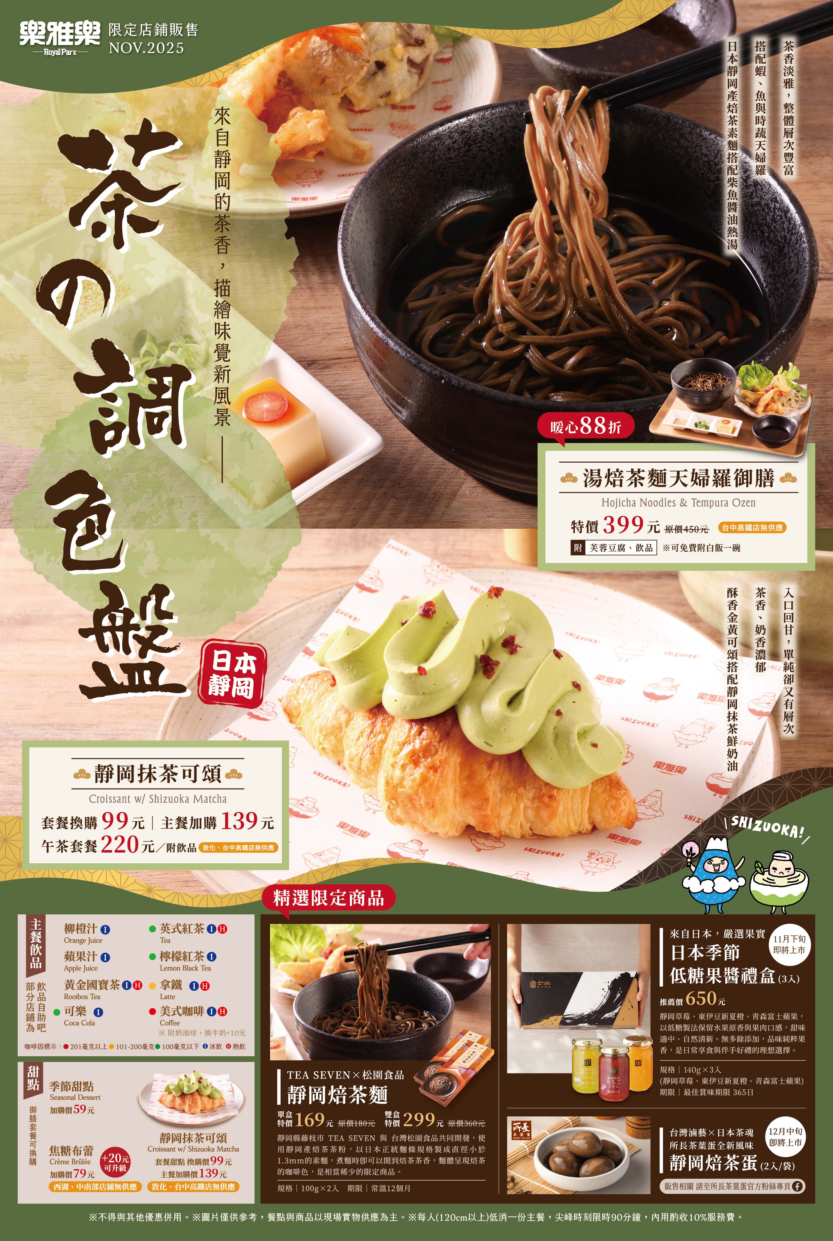 2025.11.20-12.21《茶の調色盤》來自靜岡的茶香,描繪味覺新風景。今年再次與日本靜岡縣五市二町合作,以豐富的茶文化及純淨山水聞名,嚴選當地出產的抹茶與焙茶,以「茶」為靈感的風味調色盤,推出初冬限定《茶香餐桌》的「湯焙茶麵天婦羅御膳」及「靜岡抹茶可頌」。在這個季節裡,為你帶來既暖心又暖胃的特色茶料理,再次感受靜岡茶香的美味韻致。