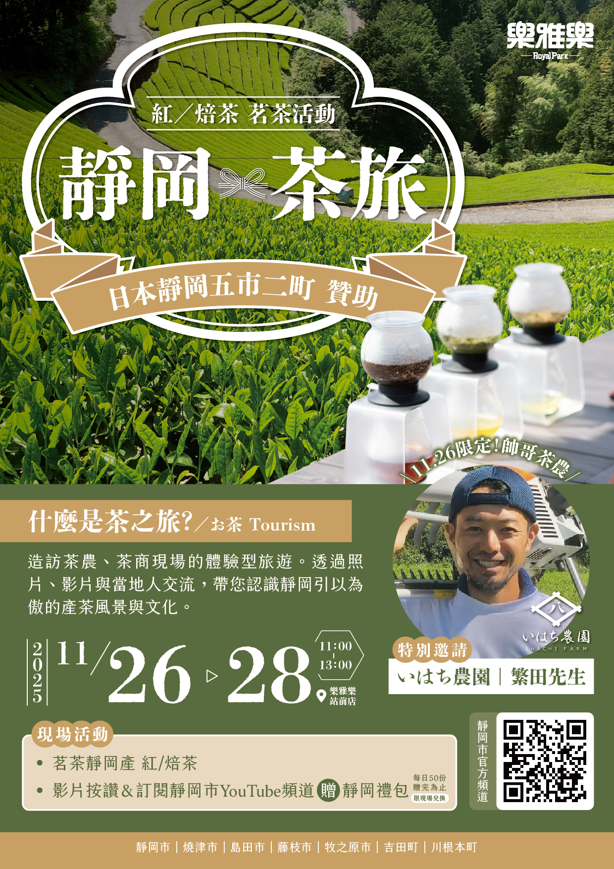 【靜岡茶旅】由日本靜岡縣五市二町贊助精心策劃,將帶你造訪茶農、茶商現場的體驗旅遊。透過照片、影片與當地人交流,帶您認識靜岡引以為傲的產茶風景與文化。於2025.11.26-28 台北站前店與大家相見,我們有舉辦活動贈送禮物,歡迎來參加