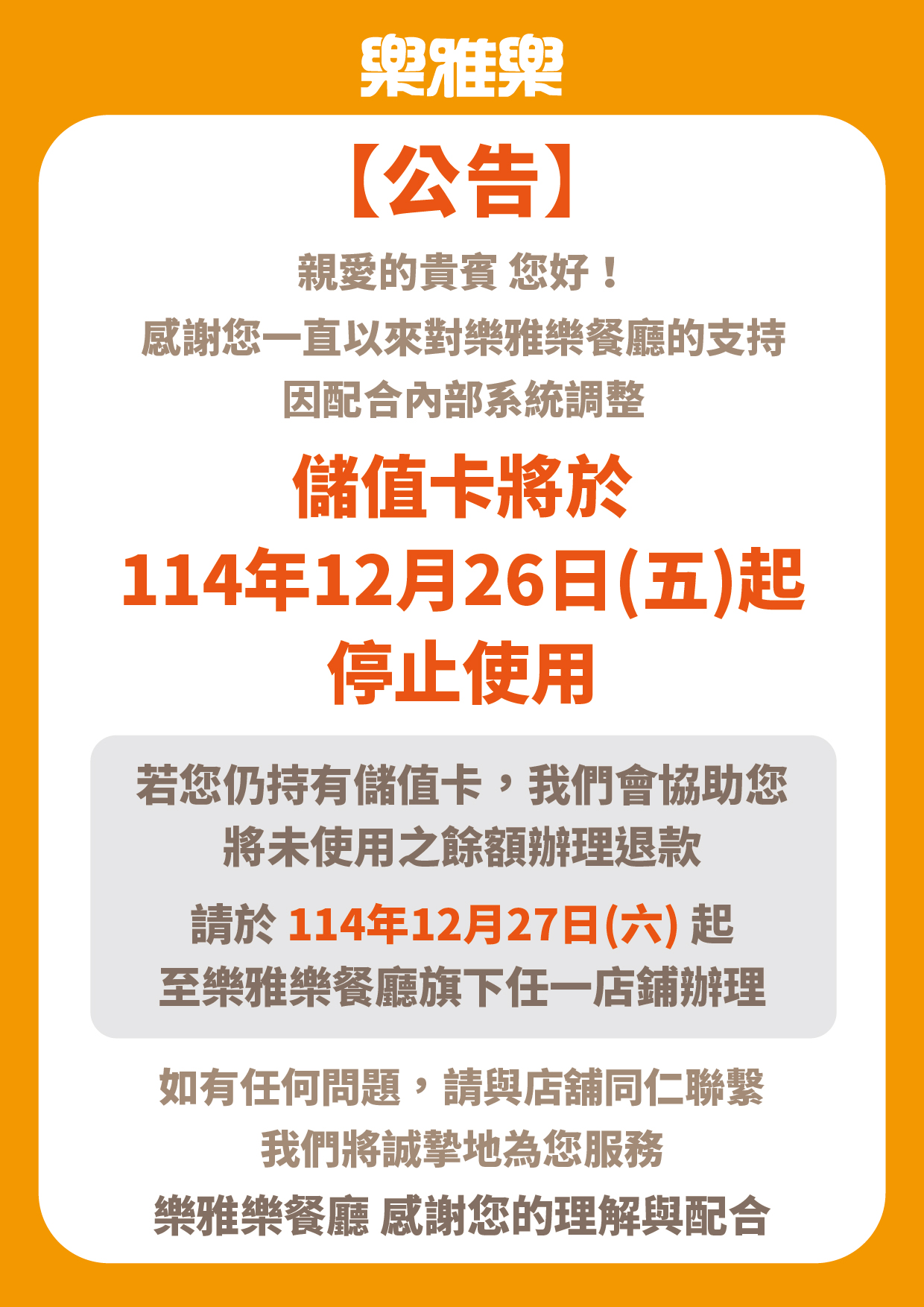 公告|儲值卡終止使用 感謝您一直以來對樂雅樂餐廳的支持,因配合內部系統調整,儲值卡將於2025年12月26日起停止使用。若您仍持有儲值卡,我們會協助您將未使用之餘額辦理退款,請於2025年12月27日起至門市辦理。如有任何問題,請與店舖同仁聯繫,我們誠摯地為您服務,感謝您的理解與配合。