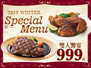 冬季限定★感恩聖誕雙人饗宴2019.11.14-2020.01.05 又到了與家人好友相聚的歡樂時節,詢問度極高X香嫩烤雞再度華麗登場!依舊鮮嫩多汁,香料豐富入味,令人愛不釋手啊!另外,也推出經典沙朗牛排、蒜香蕃茄藍鑽蝦,符合大家海陸通吃的願望!