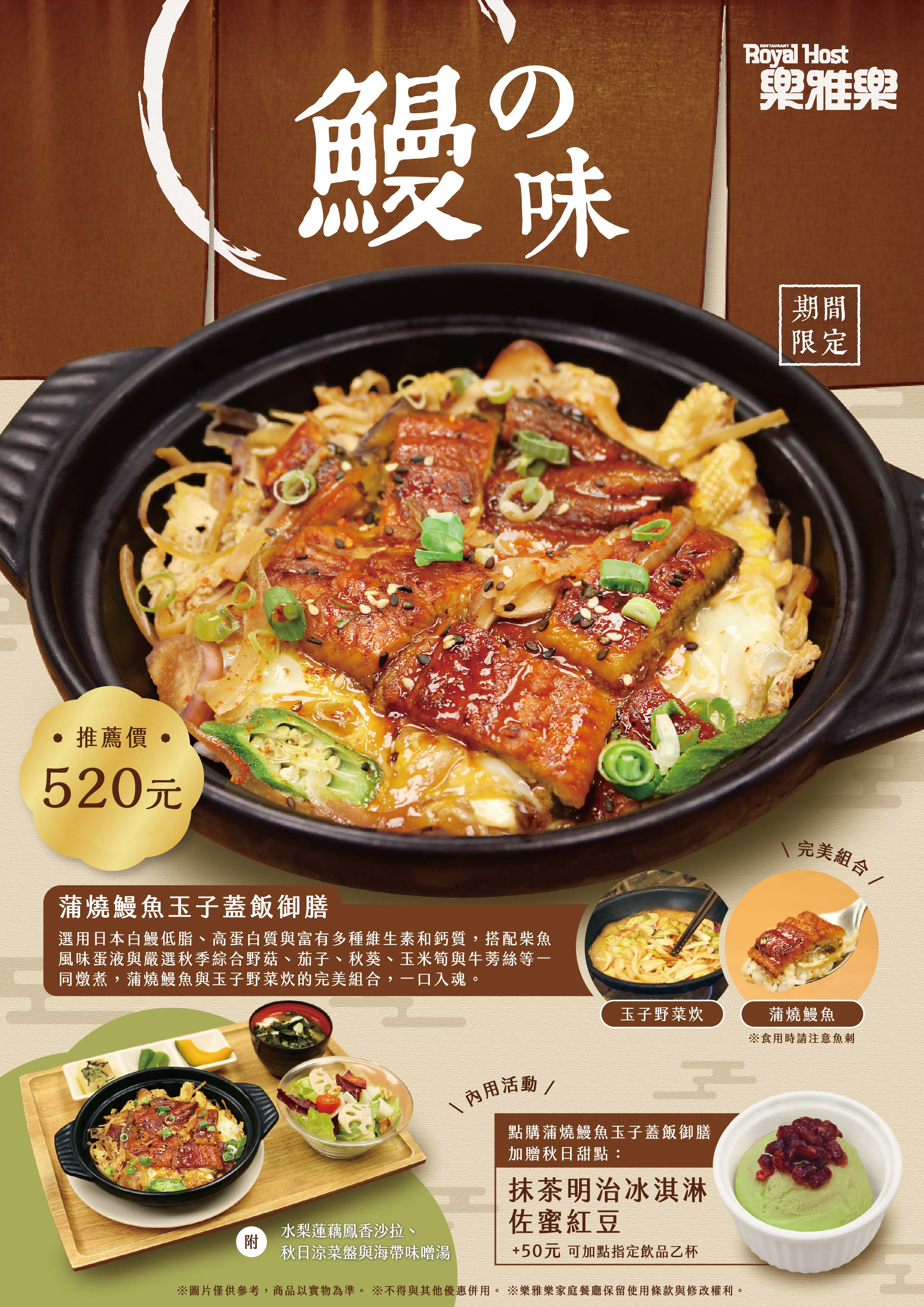 即將揮別炎熱夏日,慢慢步入涼爽秋季,又到了令人胃口大開的食材豐收季節,於2021年09月09日至10月31日期間限定推出「鰻の味.一口入魂」鰻魚日式御膳,特別準備營養價值極高的「銷日級鰻魚」,搭配柴魚風味蛋液與嚴選秋季綜合野菜一同燉煮,蒲燒鰻魚與玉子野菜炊的完美組合,為大家養身補氣、補充滿滿營養,用「吃」對抗疫情一起度過這個時期。