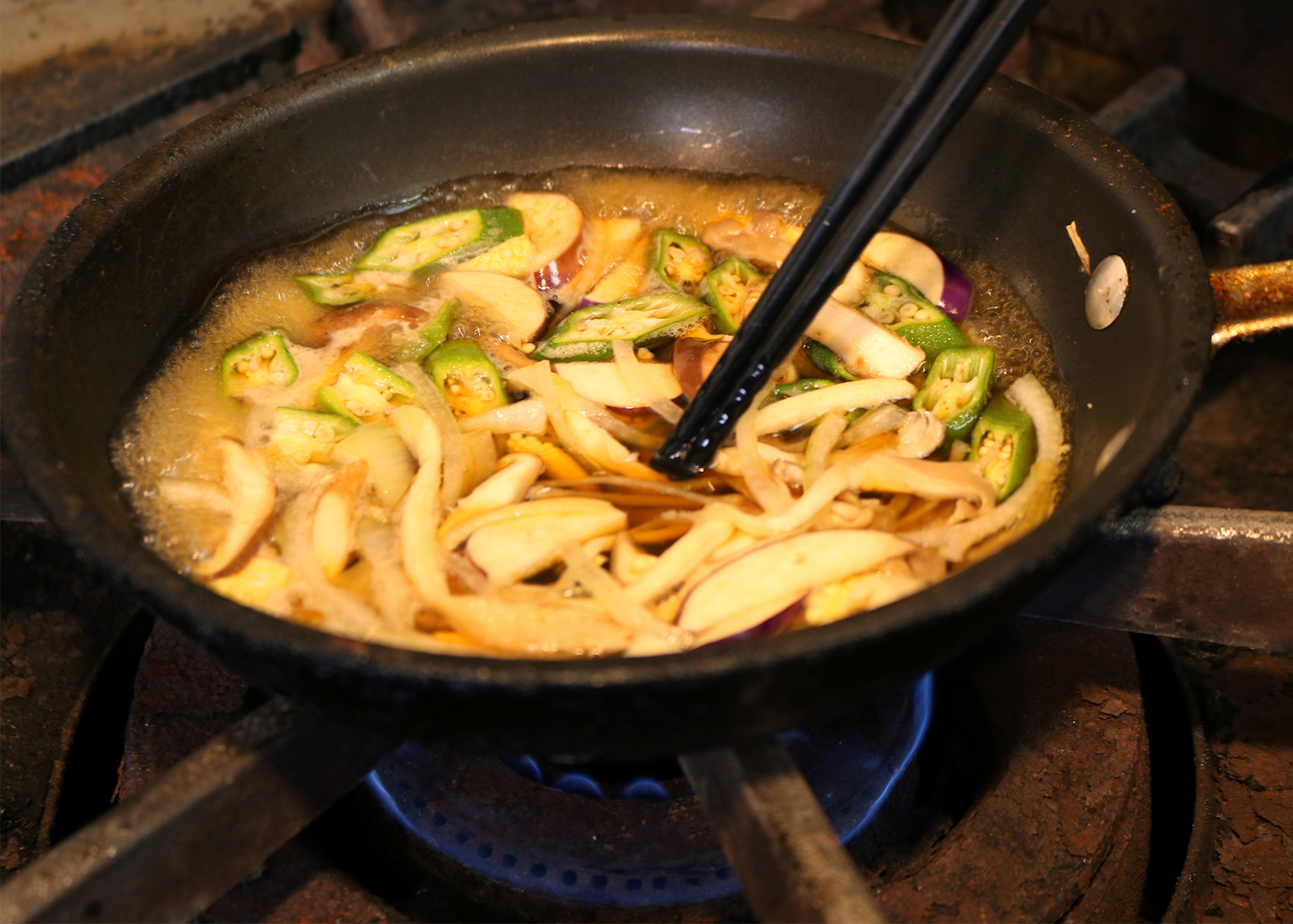 以柴魚風味蛋液與嚴選秋季綜合野菇、茄子、秋葵、玉米筍與牛蒡絲等一同燉煮。