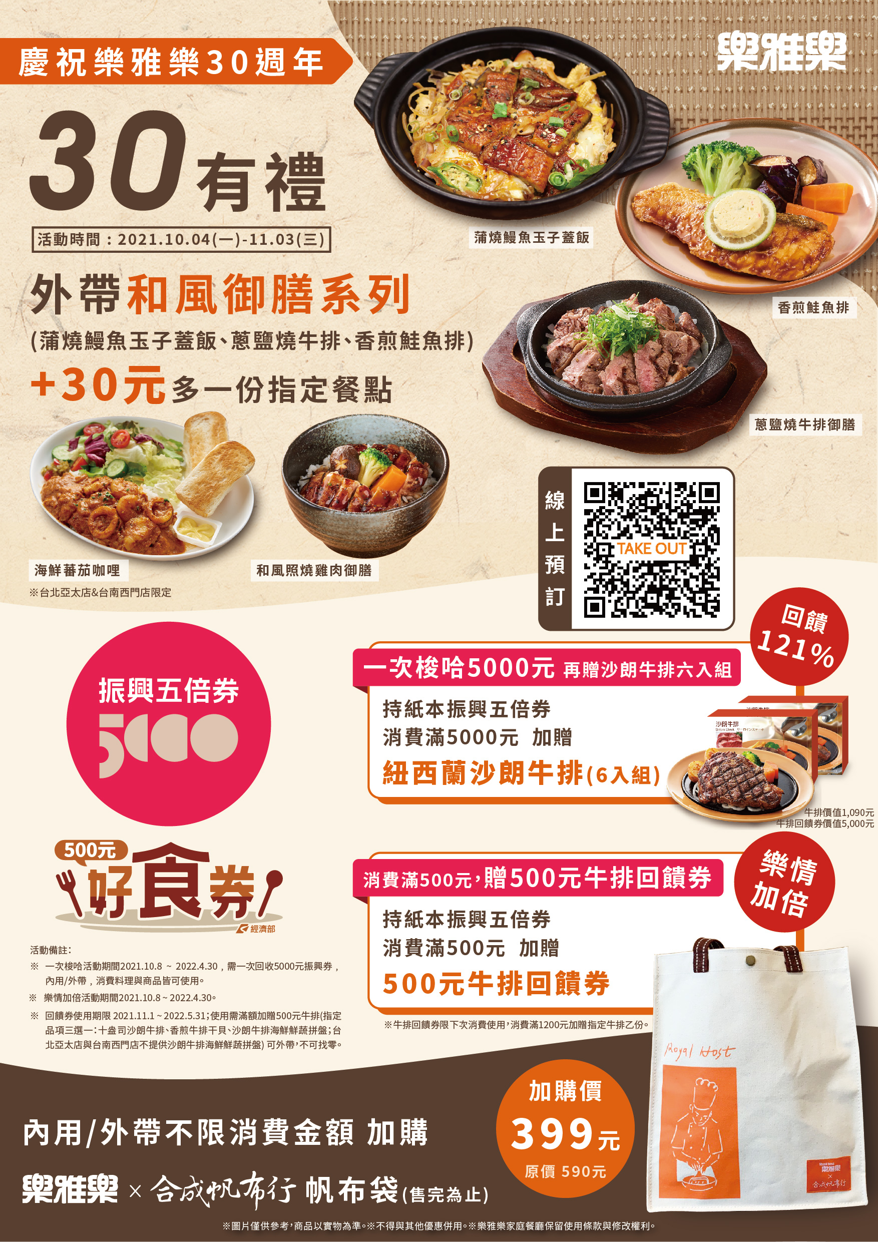 2021.10.04-11.03 慶祝樂雅樂30週年,推出多年暢銷的「外帶點購經典和風御膳,只要加30元即可多一份指定餐點」。此外「外帶/內用不限金額消費,即可享以優惠價399加購樂雅樂限量紀念款帆布袋(價值590元)」,此款特別與台南知名合成帆布行聯名合作,簡約設計、實用性高,大受好評,絕對值得收藏!(數量有限,售完為止)