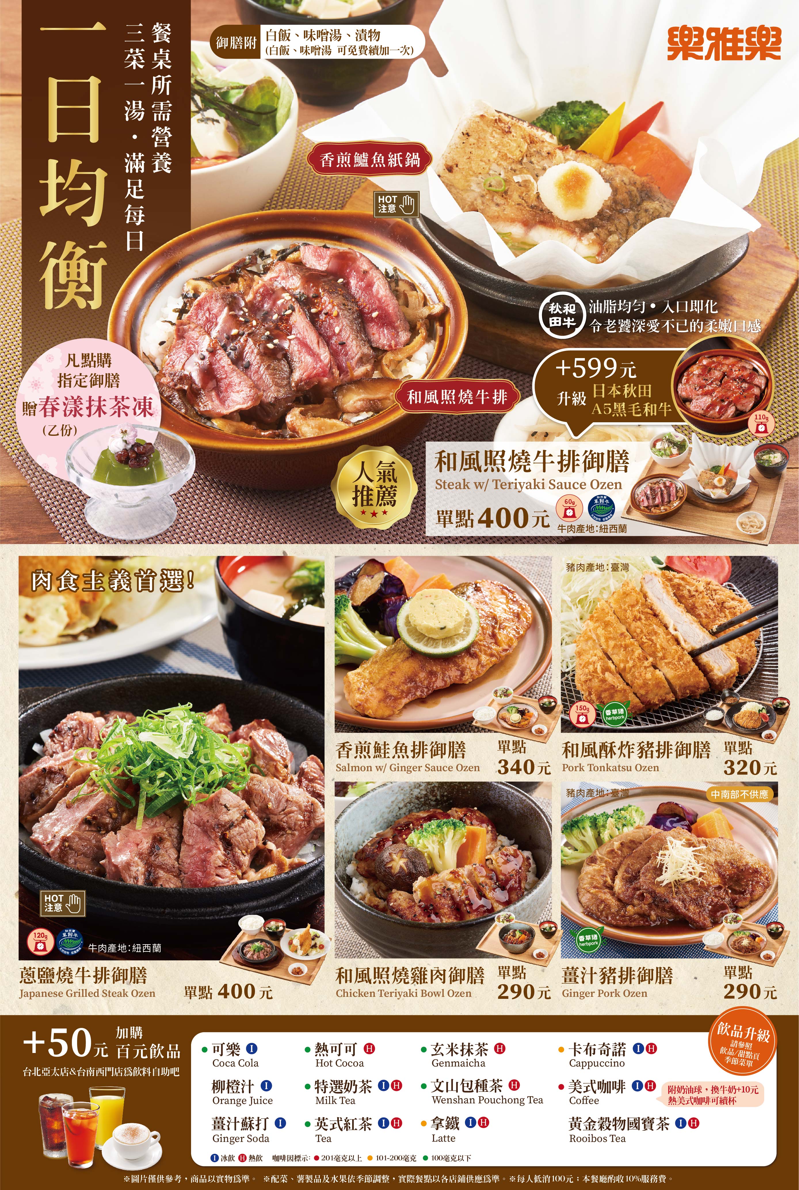樂雅樂日式御膳集結了一日所需的營養及元氣,以「三菜一湯」日式御膳基本元素為設計,對於外食族來說是一大福音,同時也滿足一家人的餐桌所需!從香煎鮭魚排、薑汁豬肉、酥炸豬排等日式家常風味外,其中蔥鹽燒牛排更是人氣首選,因此這次特別推出「和風照燒牛排」,不論醬汁及食材更是大升級,絕對能滿足喜愛肉食饕客的味蕾。