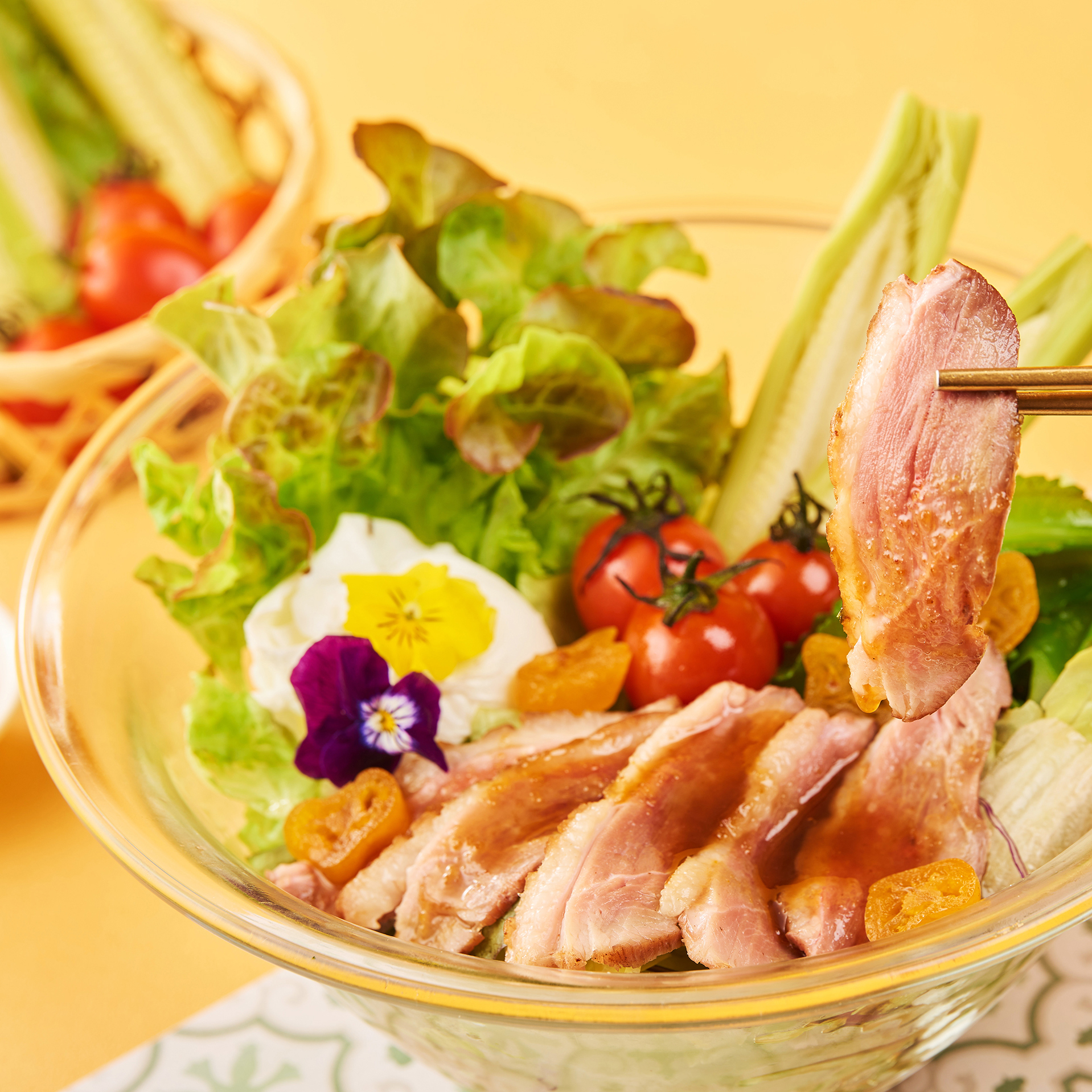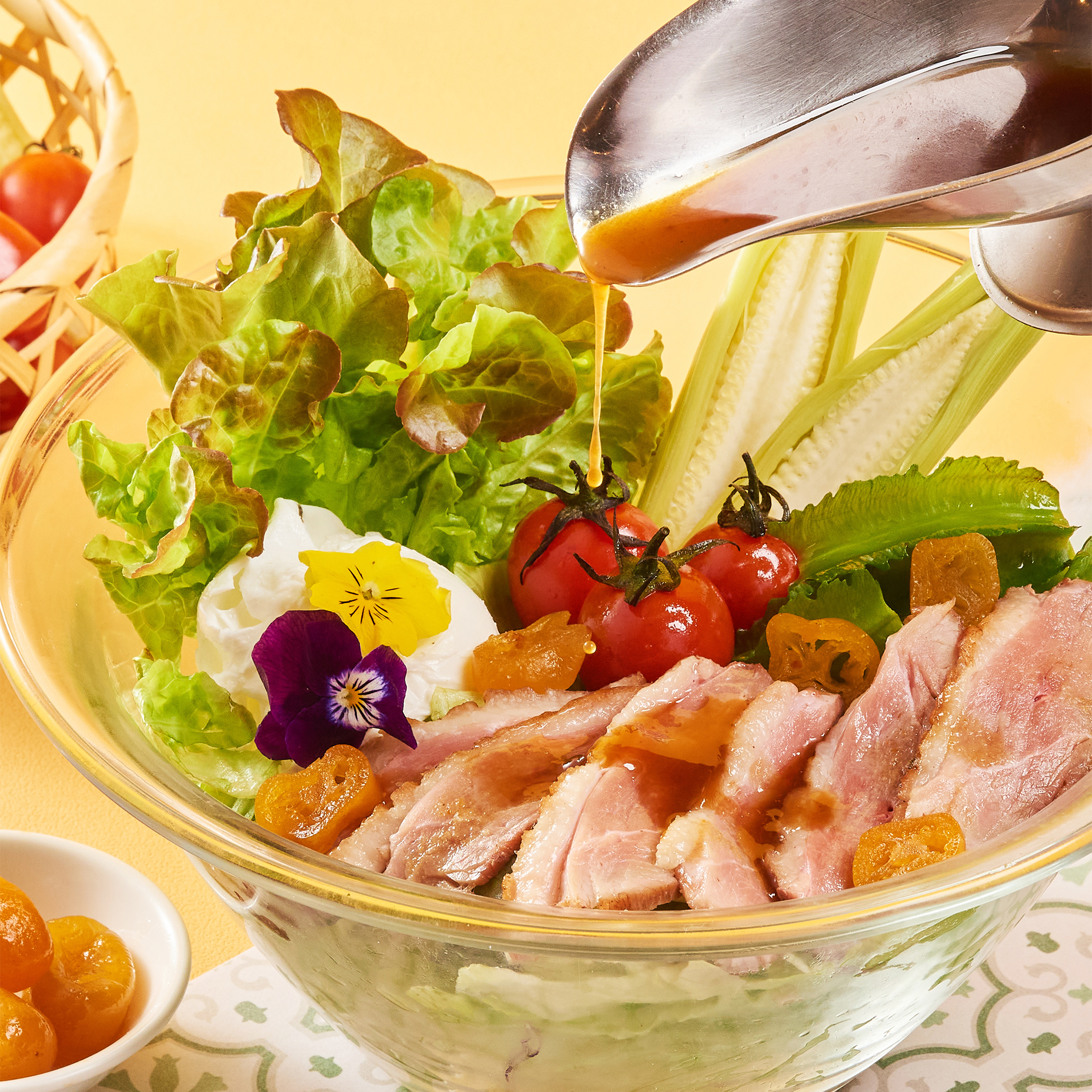 舒肥櫻桃鴨胸肉多汁鮮甜,酸甜蜜金柑、水波蛋、帶殼玉米筍、涼拌翼豆、整顆小番茄與綜合生菜搭配金桔油醋醬,花園配色、豐富上桌。