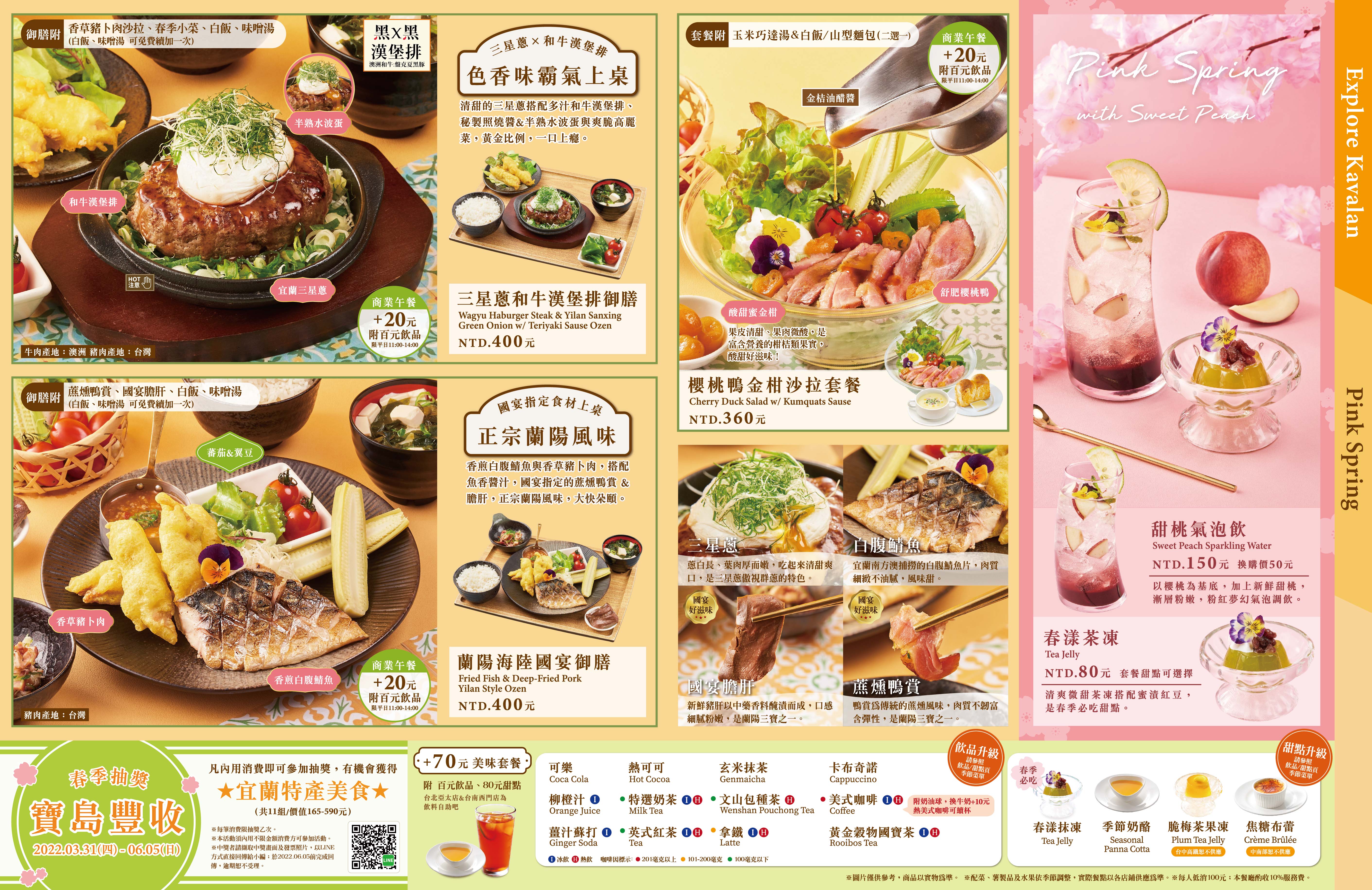 迎接溫暖春季的到來,是個採收作物的時節,樂雅樂餐廳於2022年03月31日至06月05日展開「探索寶島 • 噶瑪蘭餐桌 Explore Kavalan」精選宜蘭在地食材與日式洋食結合的多道餐點,邀請您一同享用在地美味、感受正宗蘭陽的魅力。