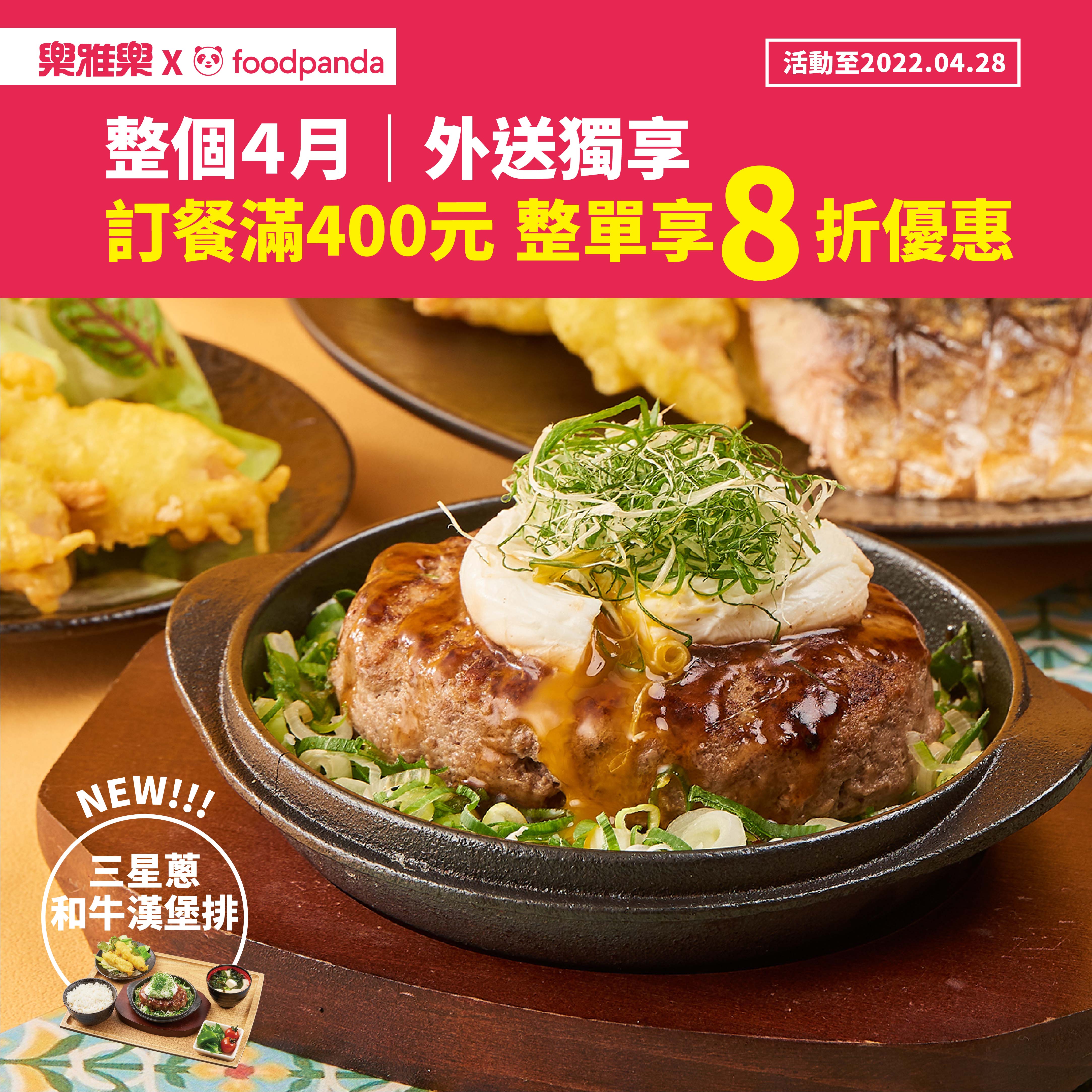 外送限定|滿額8折 2022.04.01-04.28 《foodpanda獨家優惠》連續一個月,訂餐滿400元,整單即享8折優惠。 1.本活動為foodpanda限定。 2.圖片僅供參考,皆以實際為主。 3.樂雅樂餐廳保有修改/暫停本活動之權利。 foodpanda