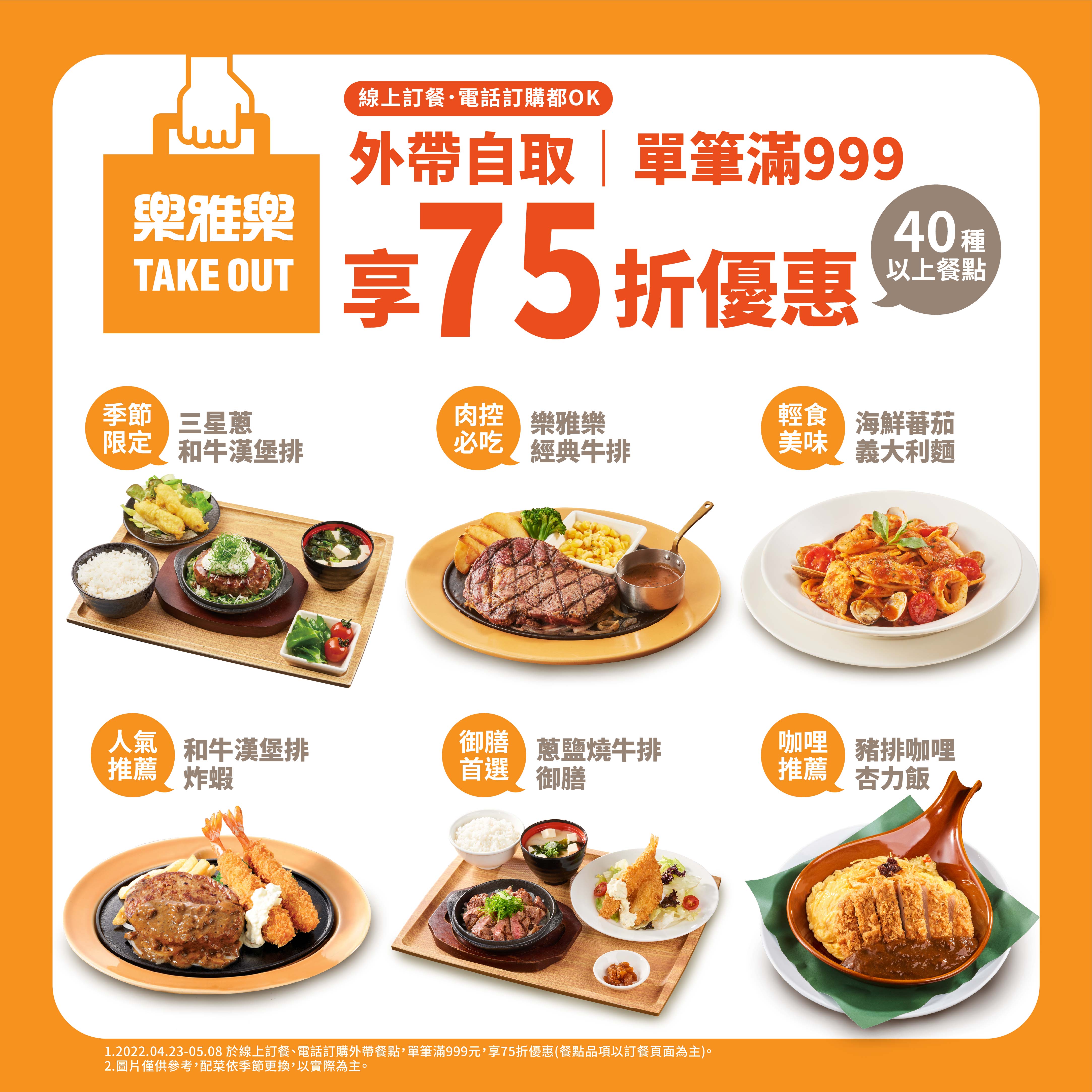 於線上訂餐、電話訂購外帶餐點,單筆滿999元,享75折優惠(餐點品項以訂餐頁面為主)。