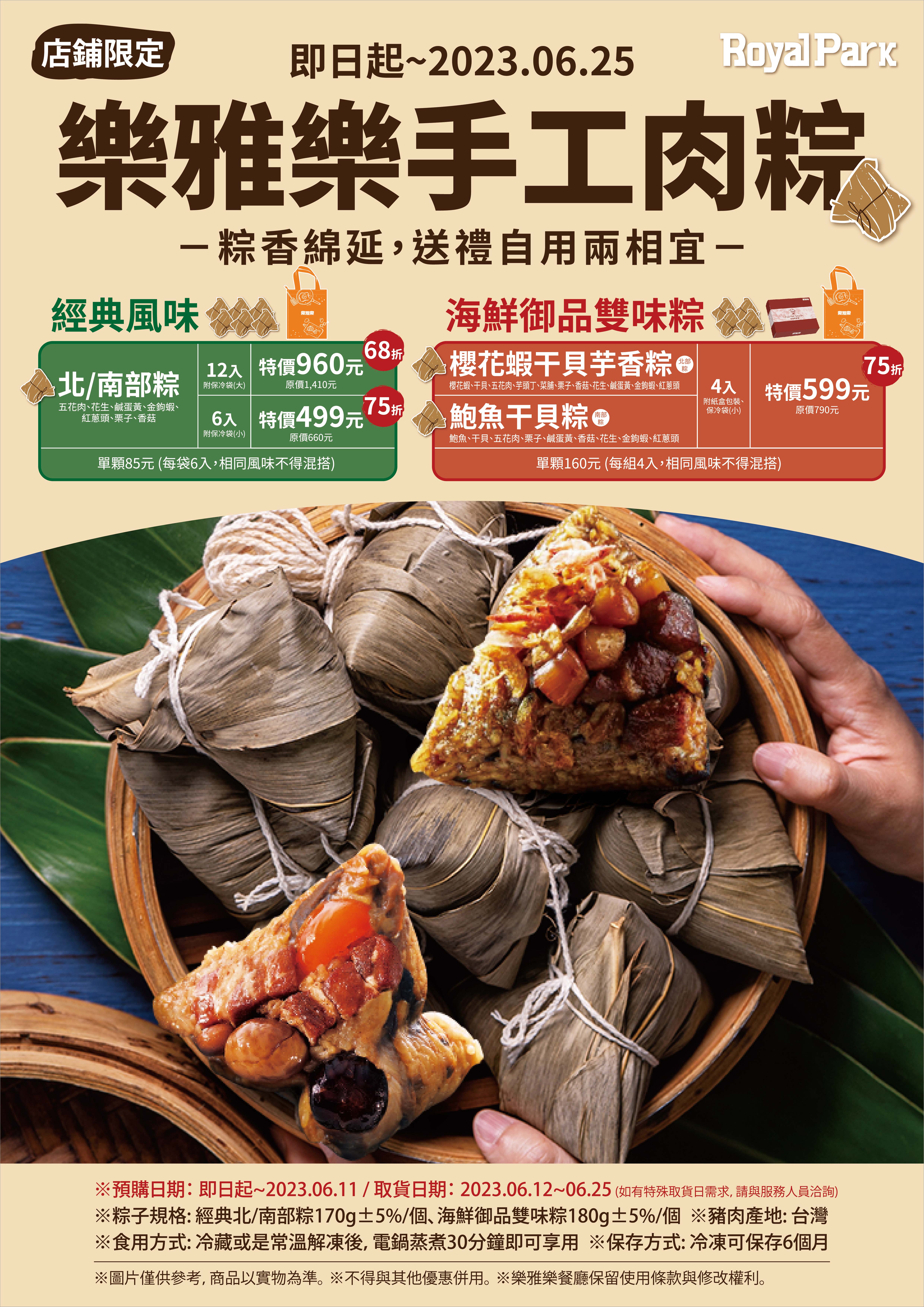 即日起至2023.06.11 「樂雅樂手工肉粽」又來囉!今年推出經典北部及南部粽外,還有海鮮御品雙味粽(櫻花蝦干貝芋香粽 / 鮑魚干貝粽)喔!熱情預購中,歡迎來電訂購!【規格】經典北南部粽170g±5%/個、 海鮮御品雙味粽180g±5%/個。