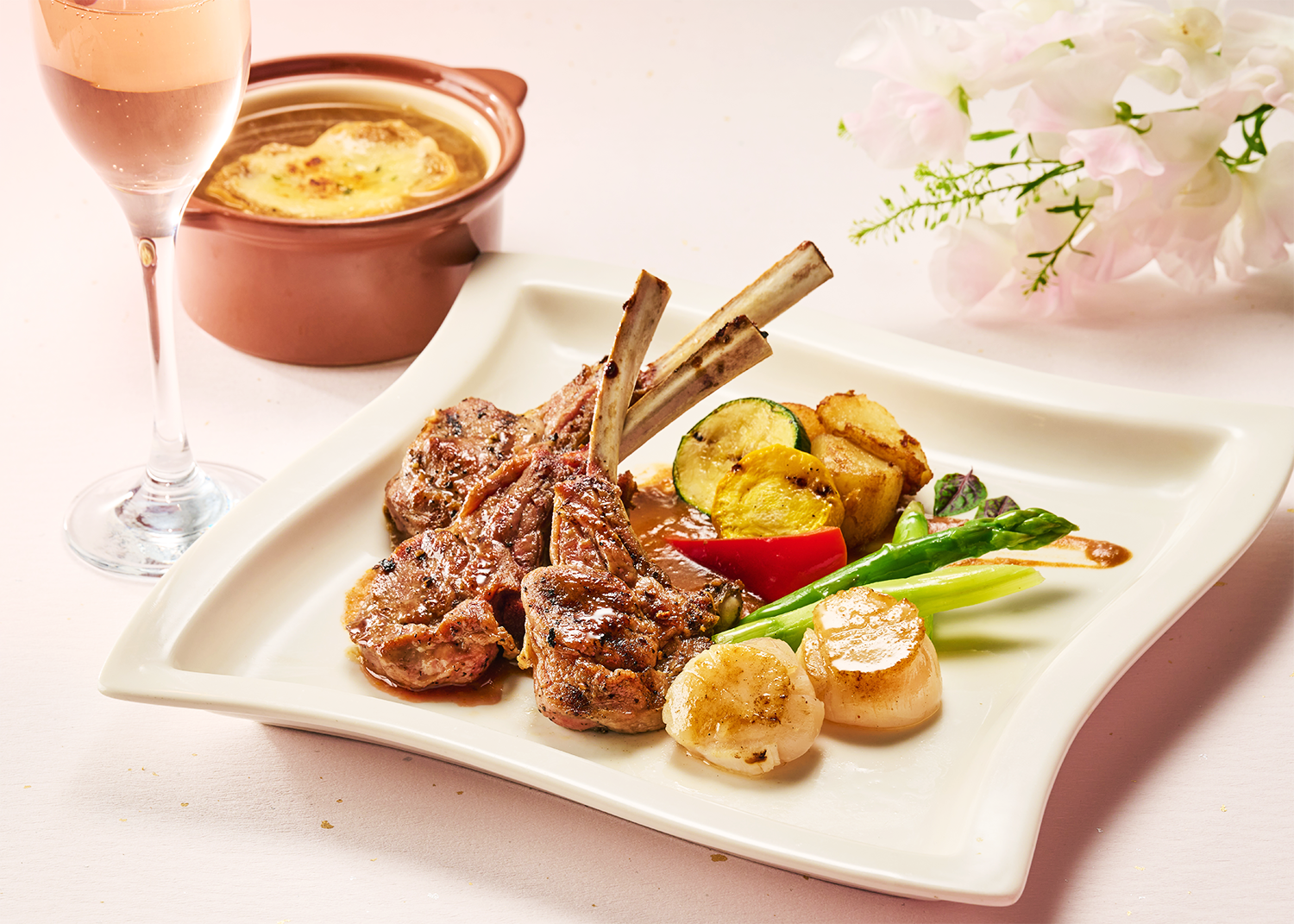 位於法國西南部波爾多盛產葡萄酒聞名,以葡萄酒加入秘製配方熬煮成濃香醇厚的波爾多紅酒醬,搭配紐西蘭稀少而珍貴6個月齡小犢草飼牛,脂肪低,肉質呈現淡淡的玫瑰色澤,口感軟嫩,風味香甜,加入北海道干貝、春季時蔬蘆筍與馬鈴薯,是一道奢華的海陸排餐。
