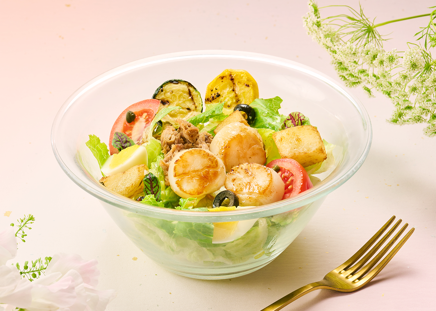 有著蔚藍海岸的南法尼斯海,繽紛色彩,北海道干貝、鮪魚、馬鈴薯、水煮蛋、黃綠櫛瓜與豐富的綜合時蔬搭配法式油醋醬,新鮮爽口上桌。