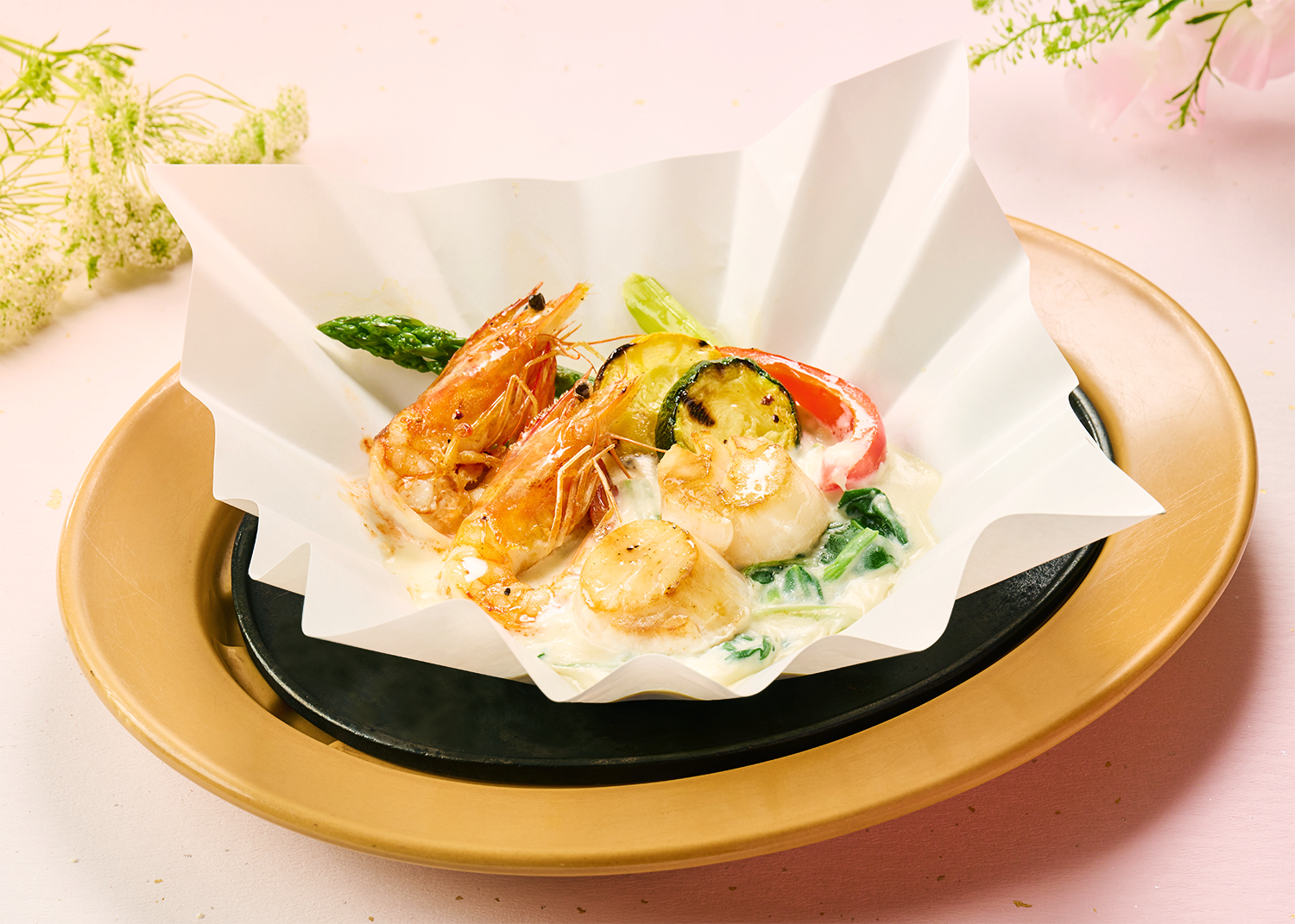 道地傳統的法式奶油醬與極鮮海產絕配組合,香醇奶油搭配淡淡果香的白酒香氣和海鮮相得益彰,搭配春季時蔬蘆筍與菠菜,是一道結合法式與日式的美味料理。