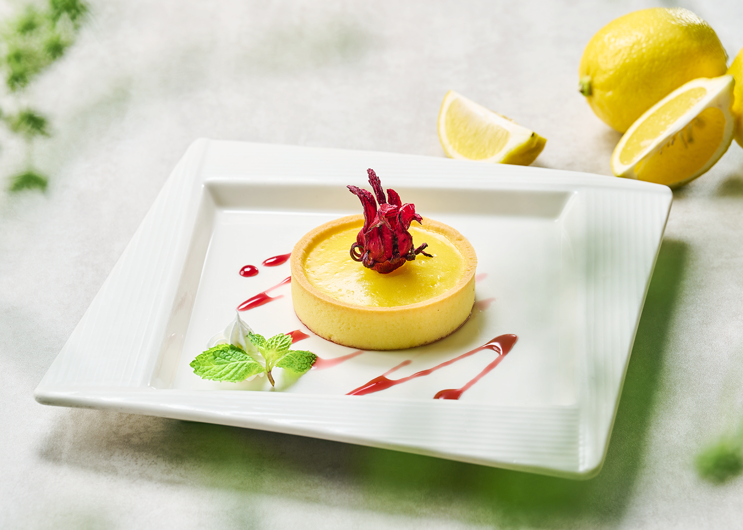 濃郁奶香塔皮與酸甜檸檬餡揉合成的法式檸檬塔,搭配清香洛神花,帶有獨特香氣,東西合併甜點之旅。
