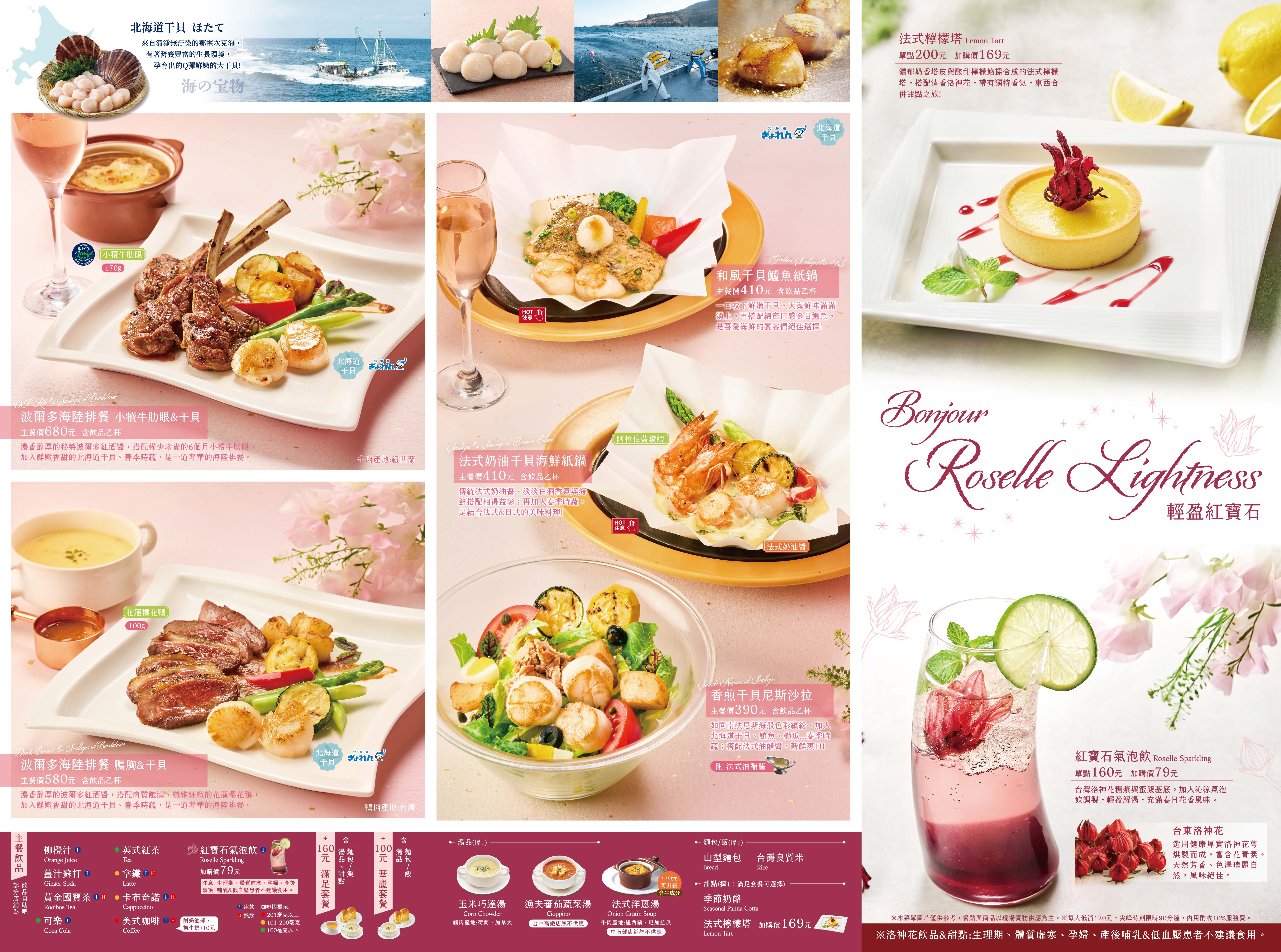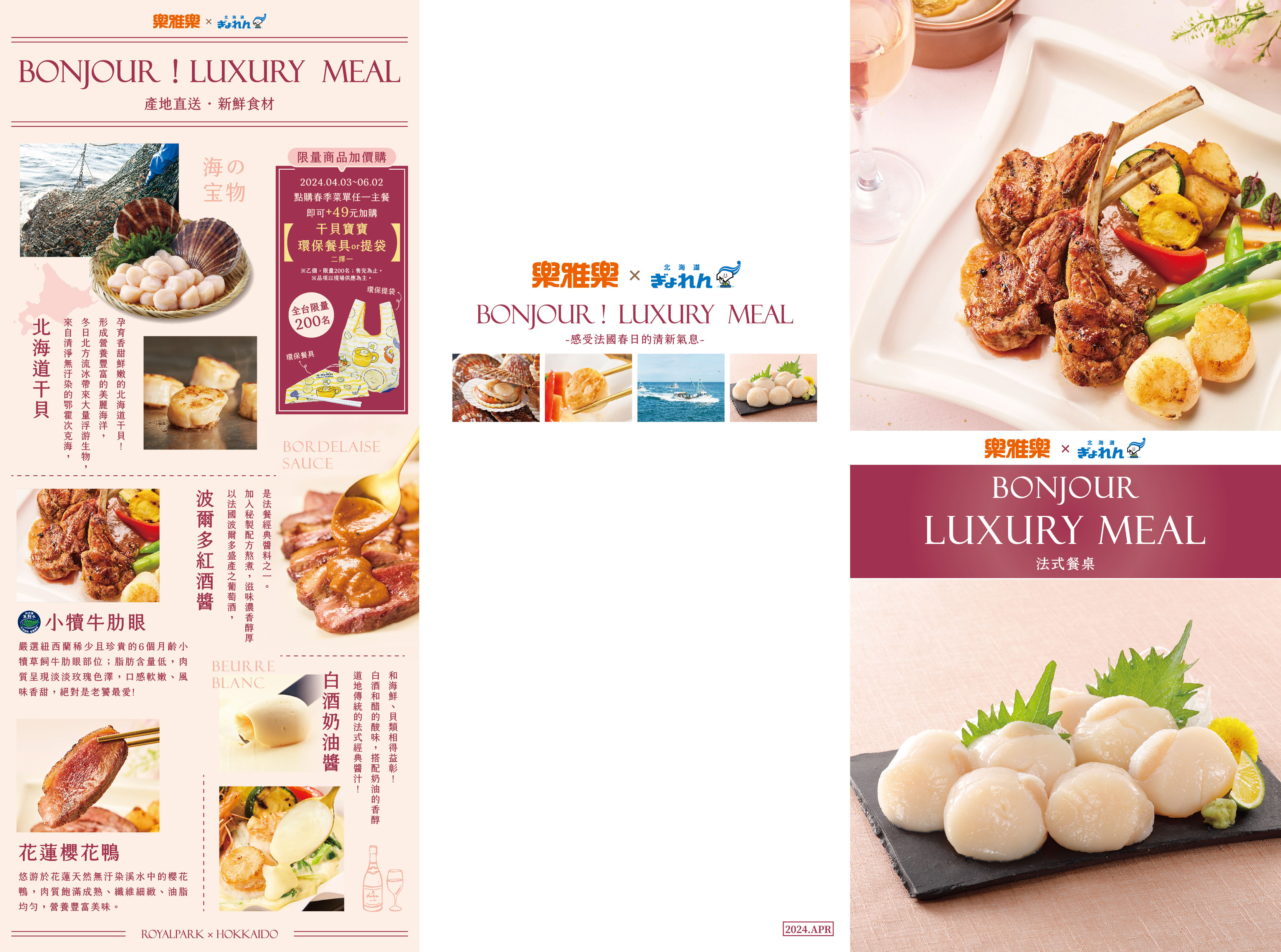 《Bonjour! Luxury Meal 法式餐桌》2024.04.03-06.02 今年春季以法式料理的風味與多樣性為靈感,巧妙運用嚴選食材「日本北海道3S大干貝」,主廚創意研發精緻又奢華的法式料理,「香煎干貝尼斯沙拉」有如蔚藍海岸之稱南法尼斯,繽紛色彩,嚴選北海道3S大干貝、鮪魚、綜合時蔬,淋上法式油醋醬,適合暖春享用。「法式奶油干貝海鮮紙鍋」以傳統法式奶油醬與北海道3S大干貝、藍鑽蝦的鮮美組合,香醇奶油中散發淡淡帶有果香的白酒香氣,完美融合日法的美味料理。「波爾多海陸排餐」以葡萄酒聞名的波爾多,主廚運用葡萄酒加入秘製配方熬煮成的紅酒醬,搭配紐西蘭小犢牛或花蓮櫻花鴨,值得奢華品味。在這浪漫的季節裡,邀請你來到樂雅樂品嚐每道餐點,一同感受到法國春日清新氣息。