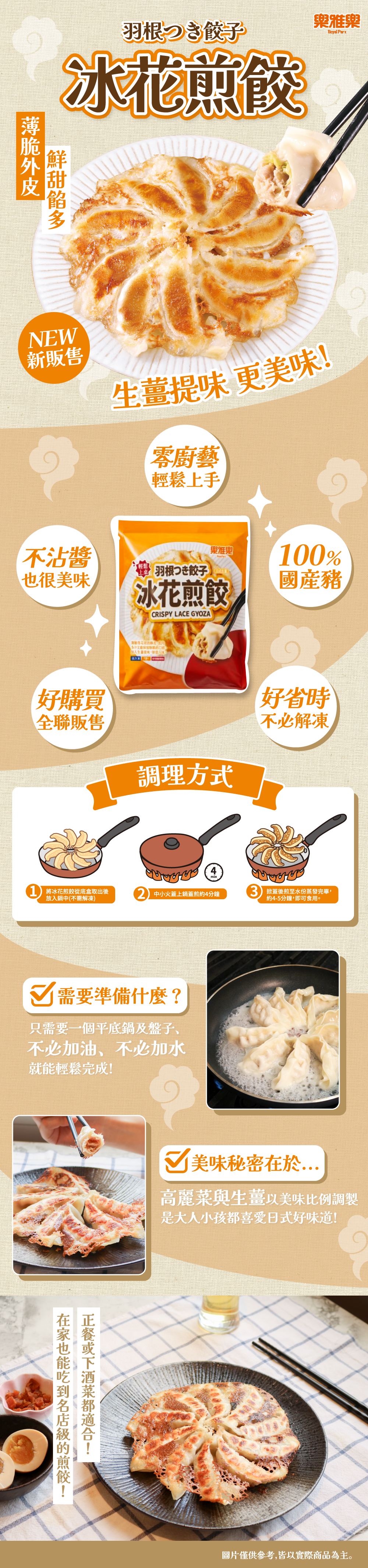 期間限定|冰花煎餃・正式販售 2025.08.29起「樂雅樂|冰花煎餃」於全台全聯福利中心正式販售!薄脆外皮有如雪花般圖紋,內餡使用100%國產豬,鮮甜多汁,安心美味!輕鬆下廚,快速上桌,在家也能吃到名店級的美味煎餃! 圖片僅供參考,皆以實際商品為主。 尋找附近全聯門市
