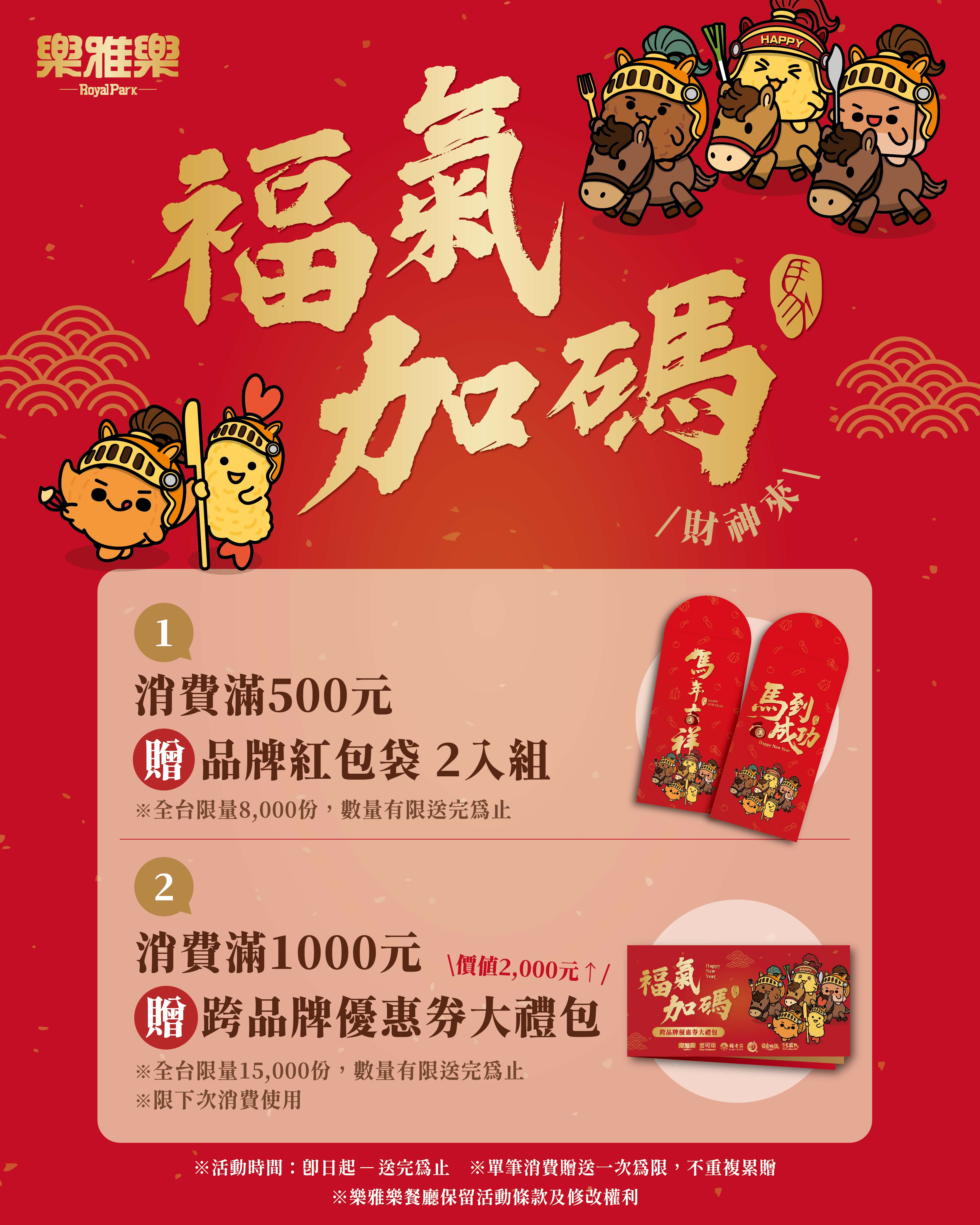 2026春節活動 2026.02.10起,單筆消費滿500元即贈品牌紅包袋2入。滿1000元加碼贈送跨品牌優惠券大禮包(價值超過2000元/限下次使用)。歡迎春節期間來樂雅樂走春,為你福氣加碼、好運馬上來! 以上活動皆數量有限,送完為止;贈品恕不累贈;樂雅樂餐廳保有修改/終止本活動之權利。 春節限定菜單 線上訂位 好運馬上來 即日起樂雅樂推出限定「馬到成功 」斗方,歡迎免費下載至IBON列印,選擇A3彩色列印即可,讓你好運跟著來,馬到成功、馬上心想事成! 立即下載