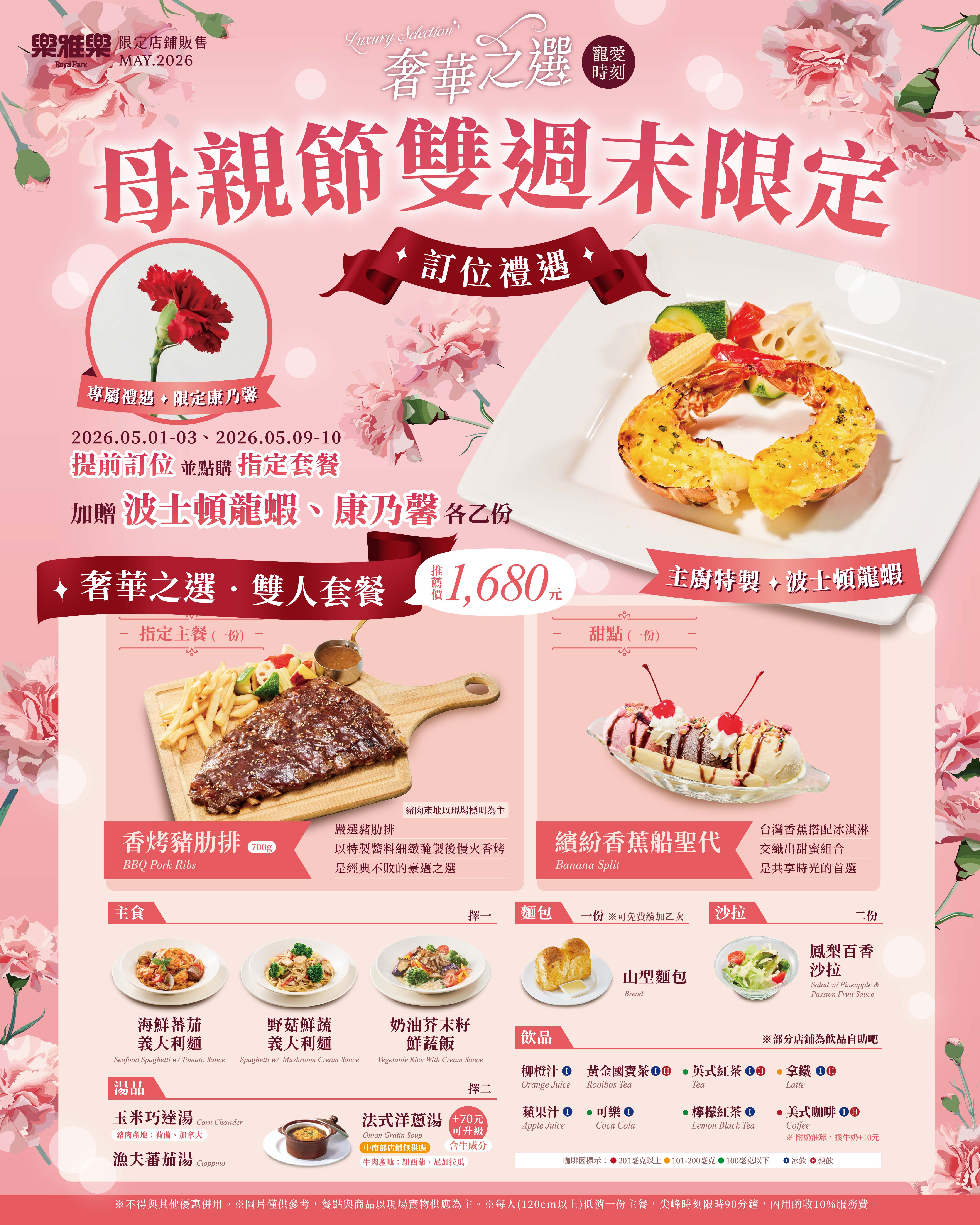 《早鳥禮遇》即日起提前訂位「母親節雙週末05.01-03及05.09-10」並點購指定套餐即贈「波士頓龍蝦、康乃馨」各乙份(價值980元)。本訂位活動不適用於台中高鐵店。豬肉產地以現場標明為主。圖片僅供參考,餐點皆以實際供應為主。